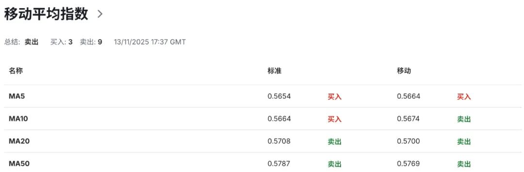 技术指标显示,日图级别上,纽币本周自布林带下轨所指向的0.5605附近区域已连续第4个交易日回升,伴随14日相对强弱指标RSI自30以下深度超卖区间回升至38附近区域,反映市场集中性抛售边际效应正在减弱,尽管空头动能当前仍然占据完全主导优势局面,但也提示短线“超涨—均值回归”风险在累积,需防范空头动能“加速-衰竭-回撤”的节奏切换。然而,在纽币短期未能回收至布林带中轨上方,以及RSI指数未能成功进入55-45强弱平衡区之前,当前任何上行仅视为技术性反弹以及汇价调整阶段,而非真实技术性或趋势性级别扭转。布林带中轨当前位于0.5700附近区域,为纽币短期价格走势结构提供多空力量以及强弱格局核心分化枢纽,若汇价可成功回收至该区域上方,则才将有望触发真实性技术反弹并推动汇价进一步走高测试布林带上轨所指向的0.5800动态区域阻力提供积极信号。布林带开口维持扩张,预示纽币短期波动率上升与下行趋势模板成立仍然保持同频,提示汇价短期“高位回落-下行延续”风险仍然维系较高水平。与此同时,布林带下倾形态限制纽币反弹斜率,MACD显示DIFF-0.0039、DEA -0.0035、MACD柱状图维持负值区间与双线位于零轴下方维持放大,显示空头动能维持放量阶段,提示空头动能偏强持续性仍在上升。如若后续柱状图呈现负值缩窄并出现零轴上方的回测,则才将有望触发真实技术性以及趋势性反弹的概率。
